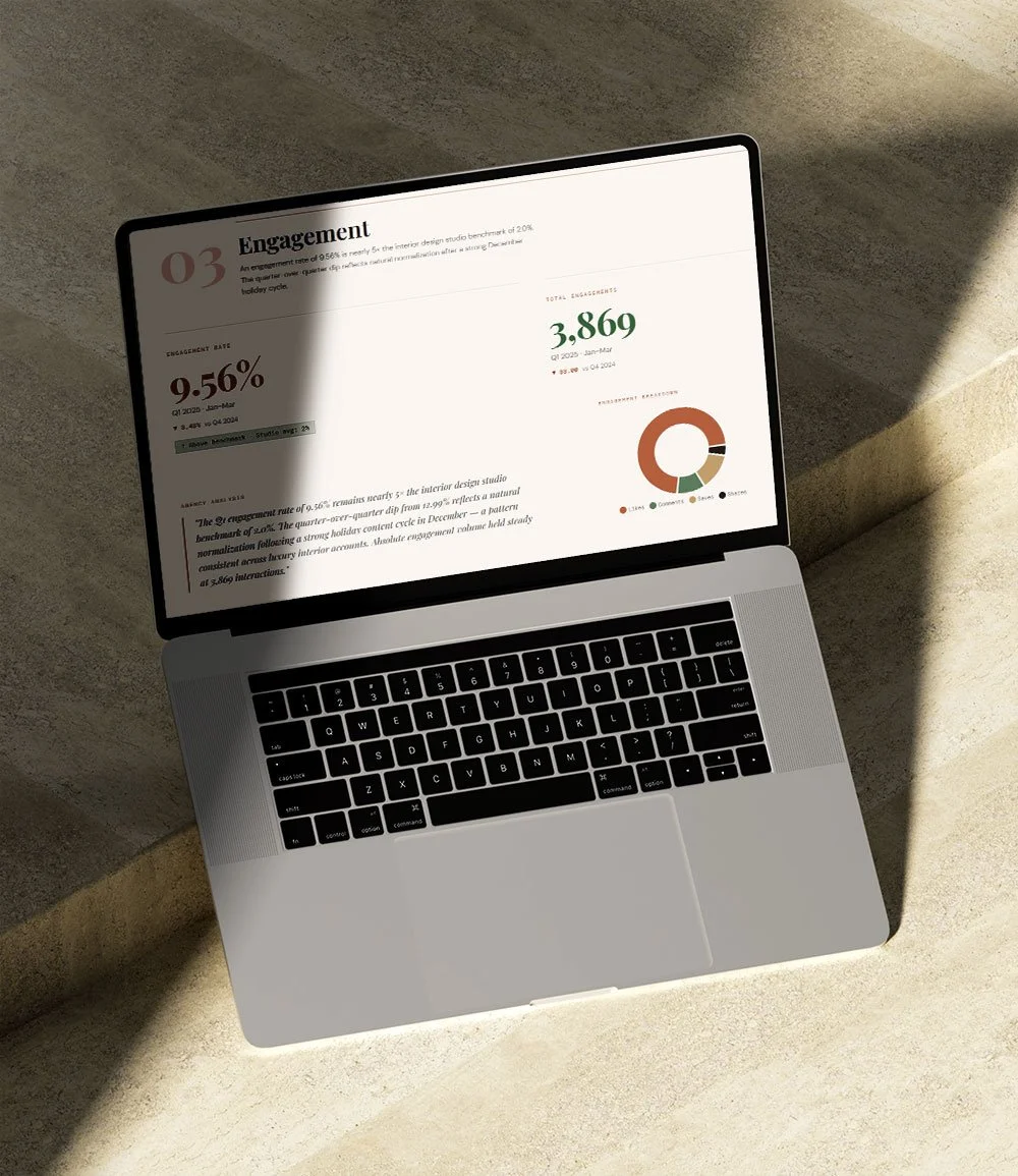 Designed as a strategic briefing rather than a traditional analytics dashboard, the platform helps you understand where your brand stands, what is driving momentum, and where to focus next. Each report combines data with interpretation, offering a concise view of performance alongside thoughtful, actionable guidance.