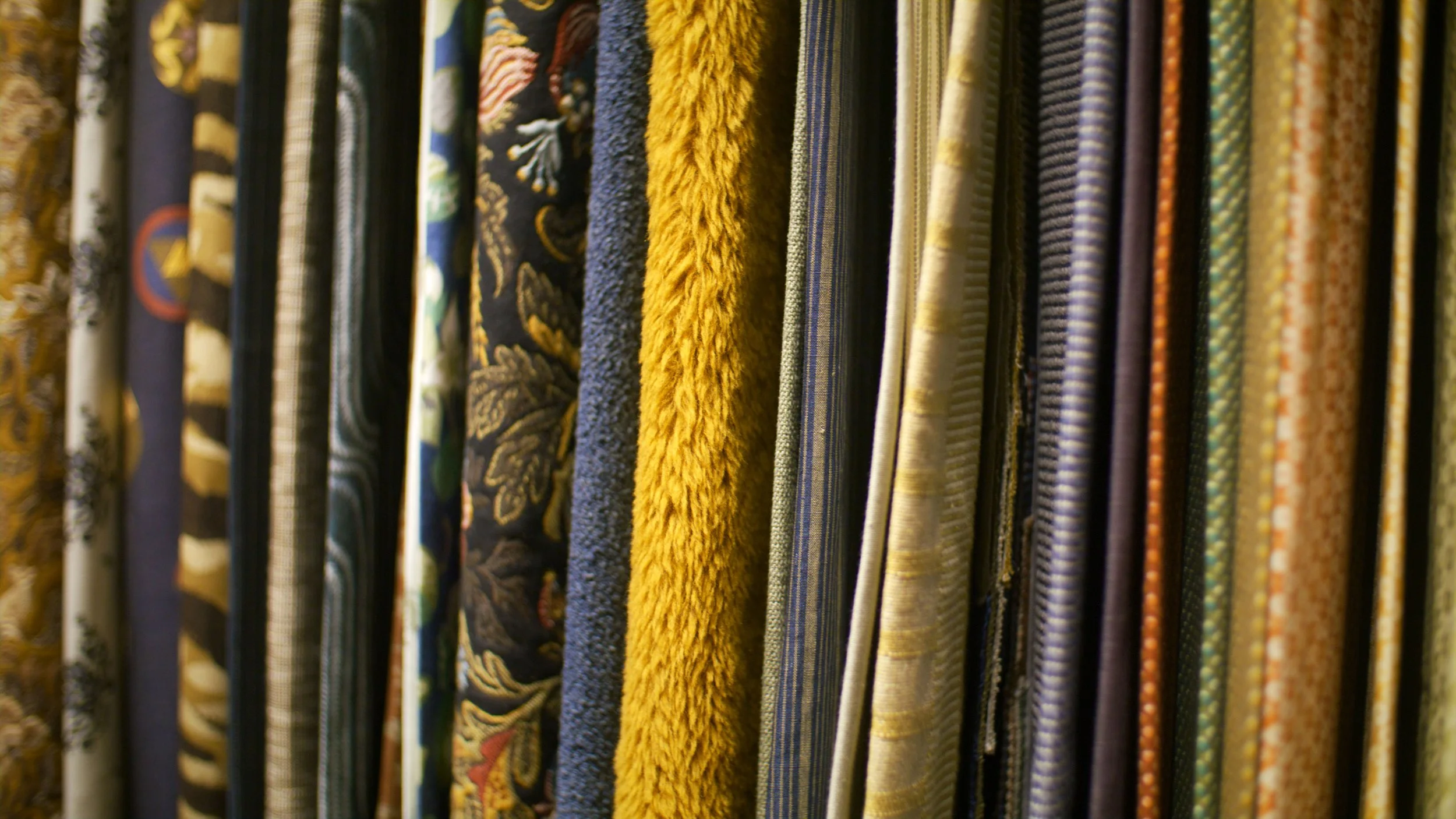 A close-up of the fabric selection at Kneedler Fauchere, a premiere design sourcing destination for interior designers in Los Angeles.